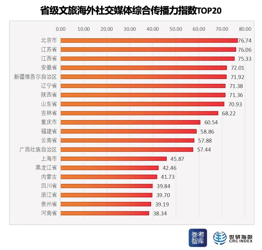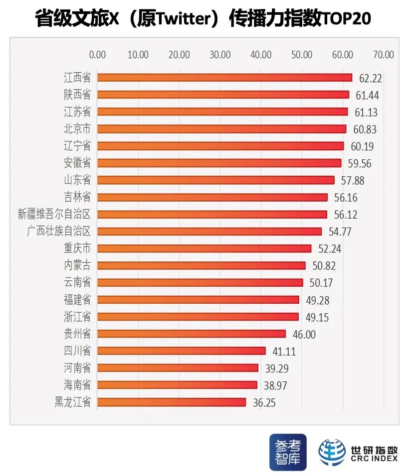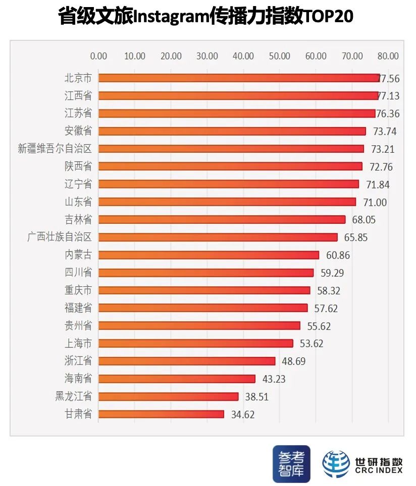 中国省级文旅海外社交媒体综合传播力指数TOP20(2024年10月)制图:世研指数