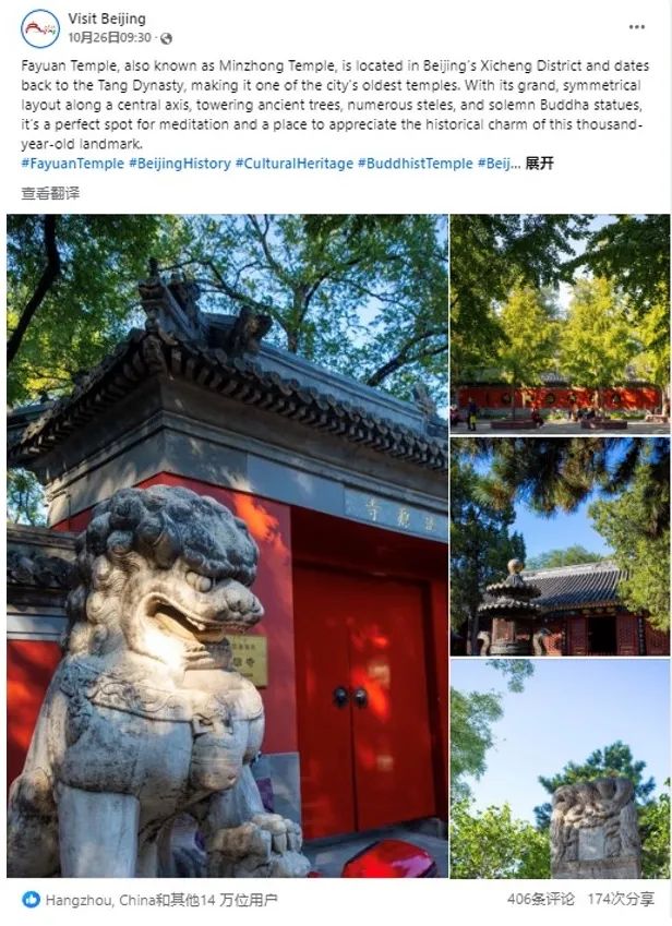 本监测周期,北京文旅就采取了上述传播策略,效果显著。10月26日,北京文旅发布网帖,介绍了北京最古老的寺庙之一——法源寺。寺庙中参天古树、众多庄严的佛像,拥有着上千年的历史,吸引无数海内外游客和信徒到此浏览参观。截至统计日,该帖文最终获得了14万次点赞,406条评论,174次转发。上述传播策略有利于提升北京文旅的海外社交媒体受关注度,也在一定程度上为繁荣北京文旅行业提供助力。
