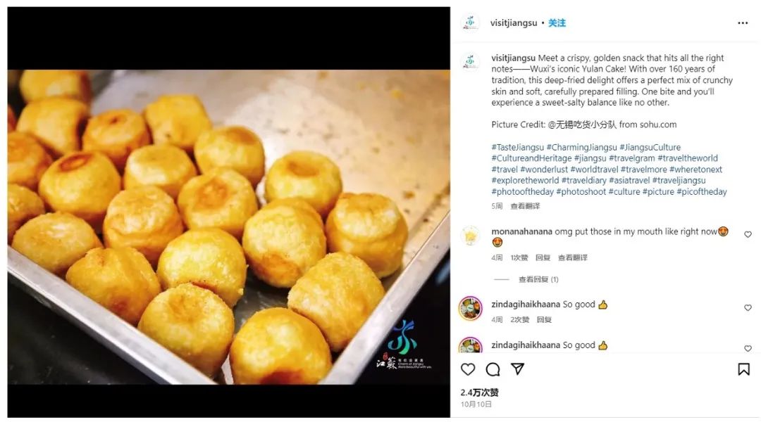 本监测周期,江苏文旅照片墙官方账号发布了一篇图片网帖,介绍了无锡小吃玉兰糕。这种油炸美食拥有 160 多年历史,外皮松脆,甜咸适中。图片精准展示了玉兰糕的特点。截至统计日,该帖文在照片墙共获得了超过2.4万次点赞。