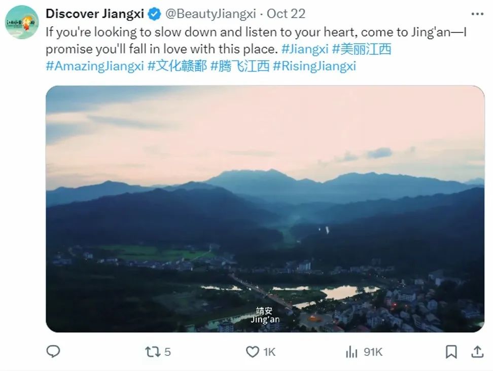 如10月22日,江西文旅账号发布了一篇以“AmazingJiangxi #RisingJiangxi”为标签帖文,以视频形式展现了江西宁静而美丽的一面,截至统计日,此篇帖文浏览量超过9.1万次,收获了超过1000次点赞。