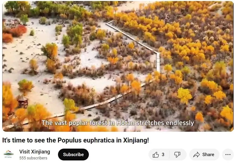 本监测周期,新疆文旅积极应用上述策略,其在优兔平台发布一支90秒的视频,介绍了美丽的胡杨林:又到了去新疆看胡杨的时候了!秋风轻轻拂过大地,金黄的胡杨林展现出生命的美丽。截至统计日,该视频共获得超过7.4万次观看量。