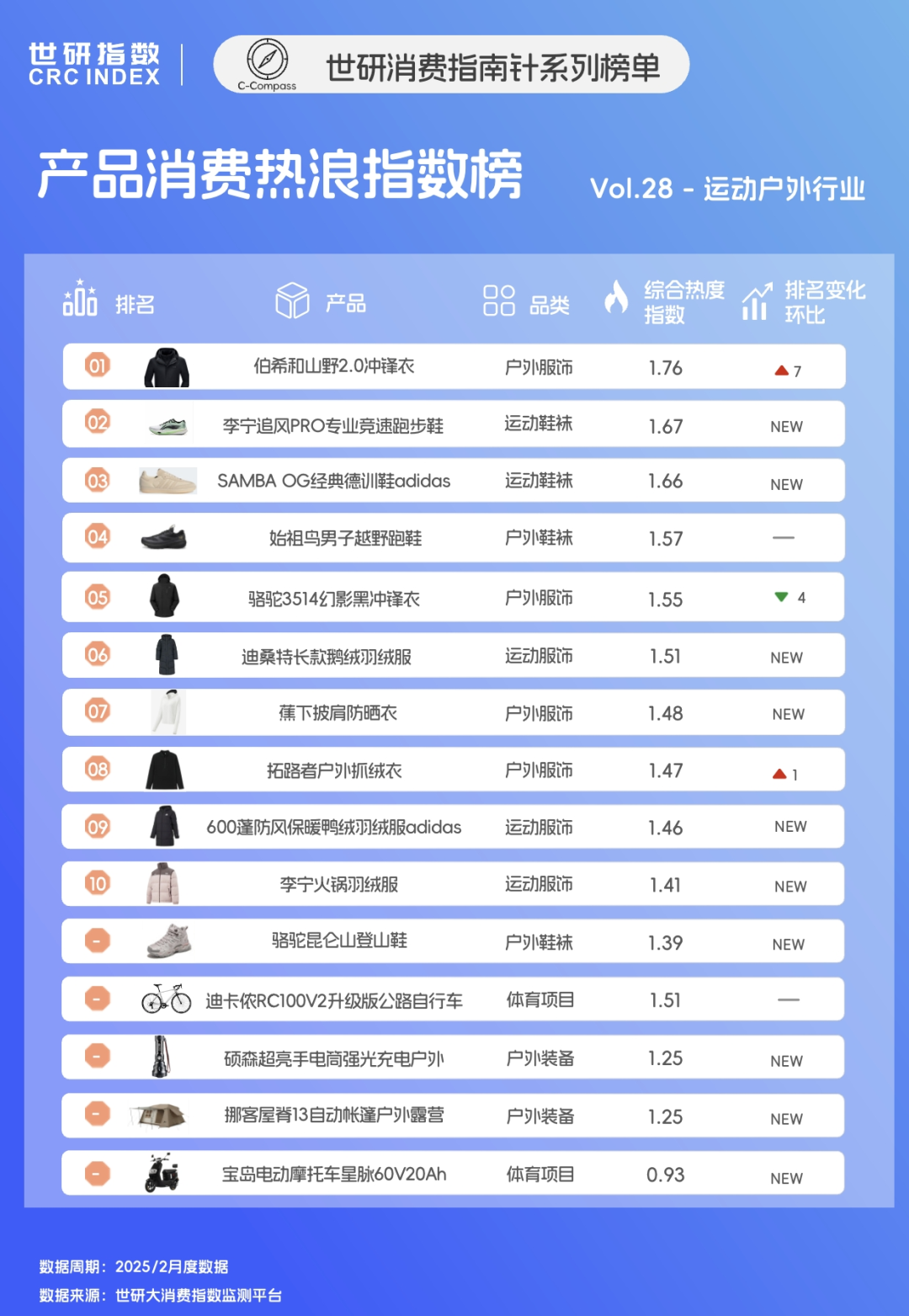 本次监测周期内,伯希和山野2.0冲锋衣、李宁追风PRO专业竞速跑步鞋和SAMBA OG经典德训鞋adidas分别以1.76、1.67、1.66的综合热度指数位列榜单前三。