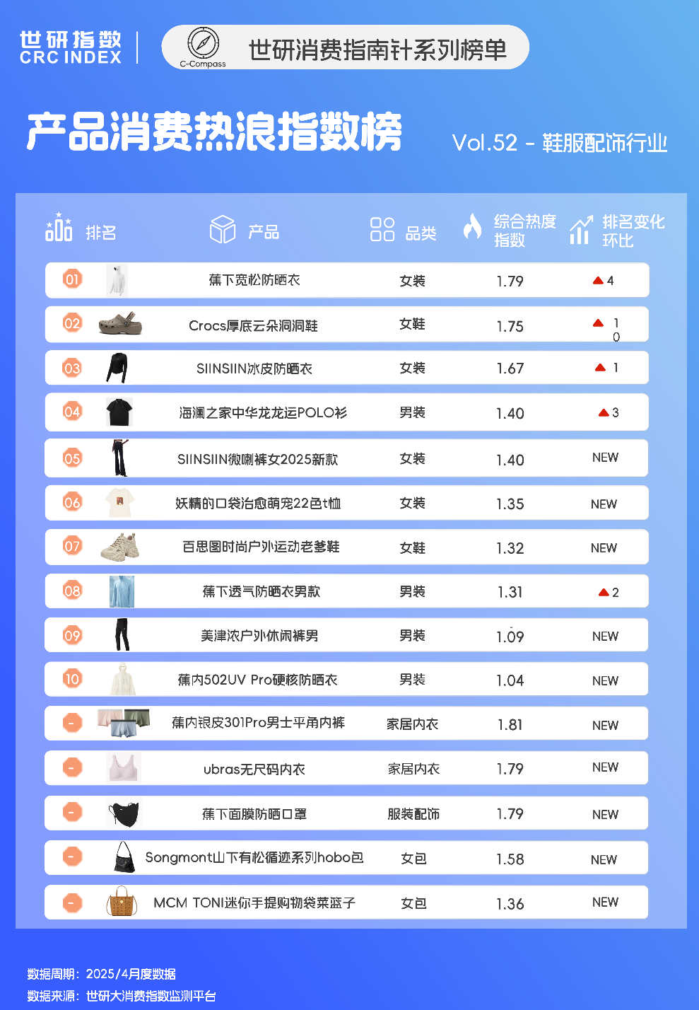 本次监测周期内,蕉下宽松防晒衣、Crocs厚底云朵洞洞鞋和SIINSIIN冰皮防晒衣分别以1.79、1.75、1.67的综合热度指数位列榜单前三。